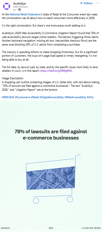 The 2026 Web Accessibility Litigation Report was a gargantuan piece of many data points. Most relevant to our buying audience were the insights surrounding E-commerce businesses. I quickly worked to create a shorter, easily digestible version of the full report aimed toward our E-commerce ICP. While the full version of the report lends AudioEye authority and credibility, the shorter "atomized" pieces act as more direct guides to specific audiences.